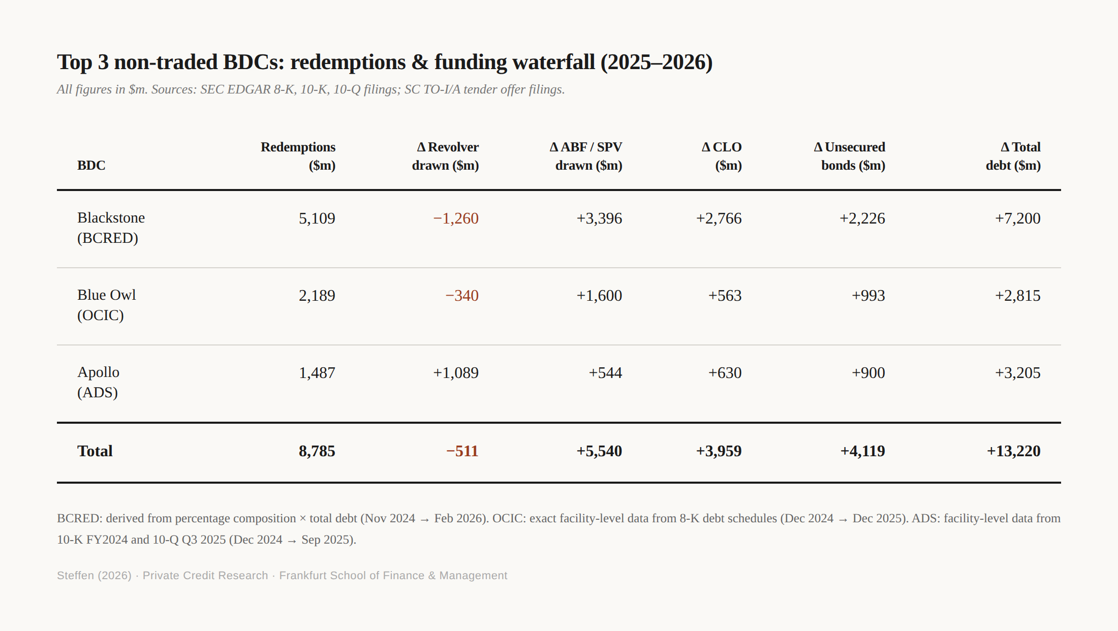 I traced the funding structure for the three largest non-traded BDCs — Blackstone's BCRED, Blue Owl's OCIC, and Apollo's ADS — through their SEC filings over the past twelve months. Together these three vehicles processed $8.8 billion in share repurchases, the majority of redemptions that have dominated headlines since January (in fact, 10 BDCs account for >90% of all redemptions). The question I wanted to answer is very simple: where did the money come from?