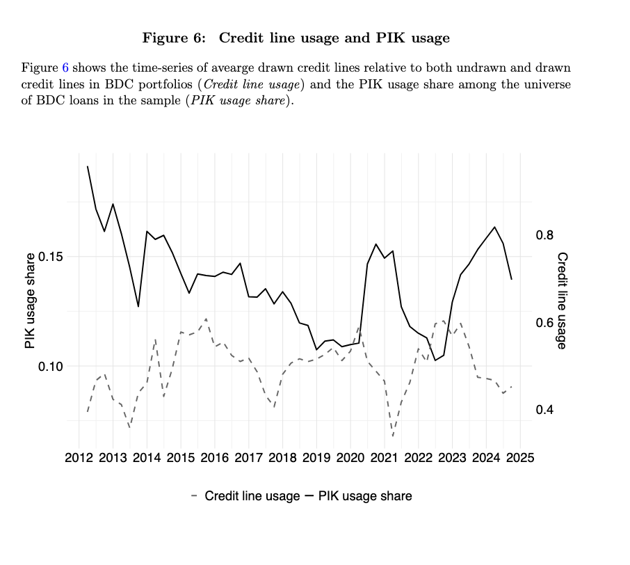 My research with Paul Rintamäki (paper is available here) shows that conversion PIK, existing cash-paying loans switched to PIK mid-contract under distress, predicts significantly worse credit outcomes and leads to maturity extensions rather than restructurings. The dollar amount of PIK in BDC portfolios reached $62.8 billion at Q4 2025, more than double the level at Q4 2022. The value-weighted PIK usage share stood at 12.72%, though this partly reflects compositional effects as large loans entered the denominator. Figure 6, from our BDC sample, shows the relationship between credit line usage and PIK usage over the full 2012–2025 period.